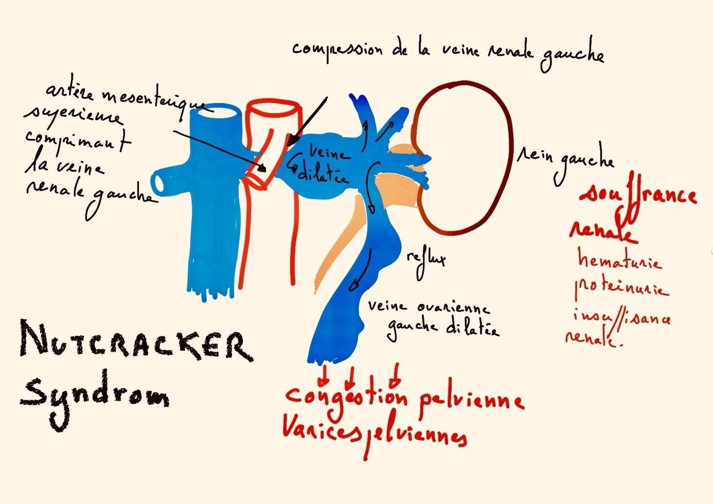 Le syndrome du Nutcracker (nutcracker syndrom, casse noix, compression de la veine rénale gauche) est, de manière schématique, une compression de la veine rénale gauche par l’aorte et l’artère mésentérique supérieure.