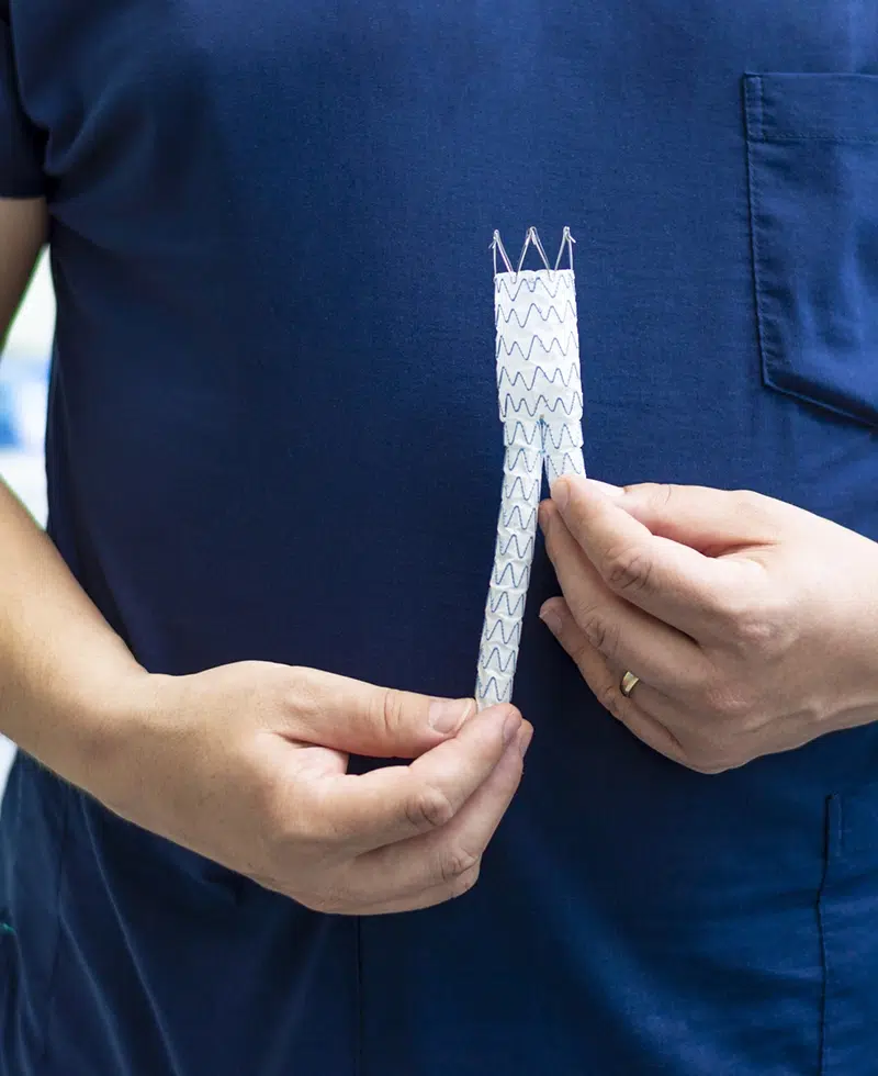 Cette approche mini-invasive consiste à introduire une endoprothèse par les artères fémorales, afin d’exclure de la circulation l’anévrisme (le sang circule dans l’endoprothèse mais par dans l’anévrisme. On met un tuyau sain dans le tuyau dilaté)